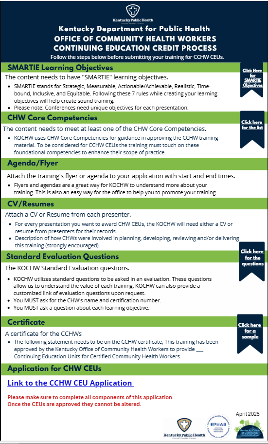 - Official state process through Kentucky Office of Community Health Workers.