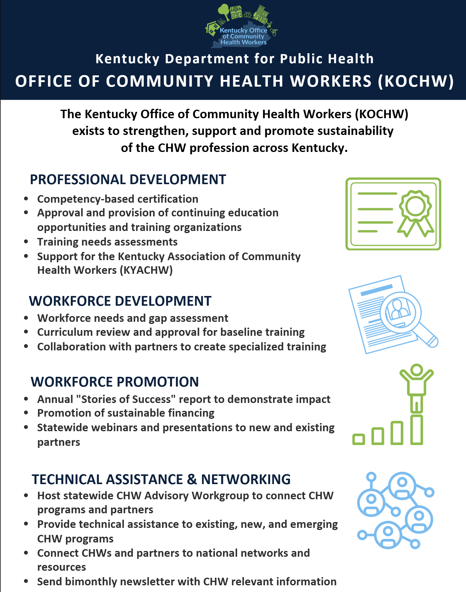 The Kentucky Office of Community Health Workers (KOCHW) serves as the official governing authority for Community Health Worker certification in Kentucky. KOCHW issues certification to individuals who meet established requirements, including successful demonstration of the eight core competencies through qualified training programs or documented work experience.